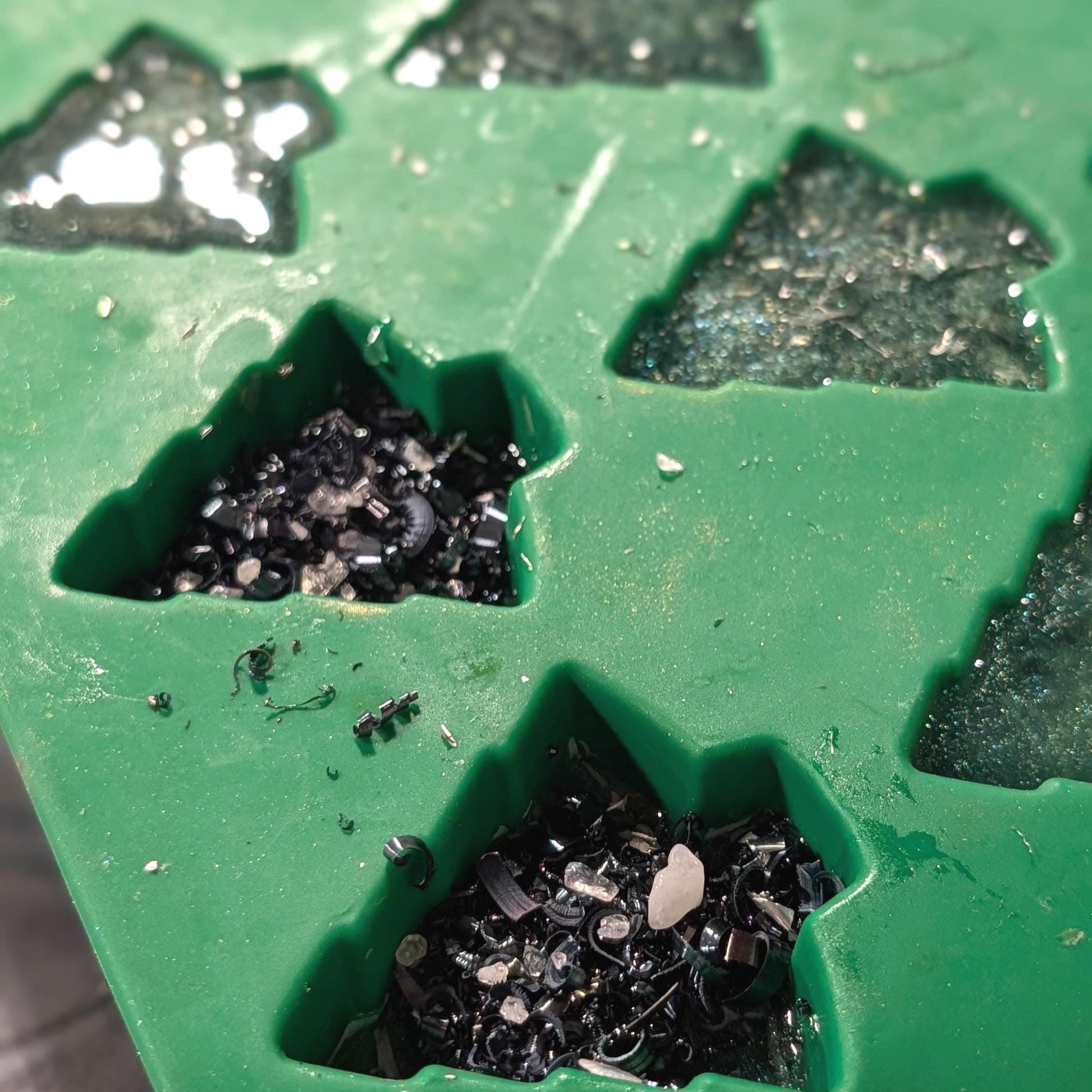 We use a blend of resin, metal shavings, and quartz crystals—materials commonly used in orgonite crafting.