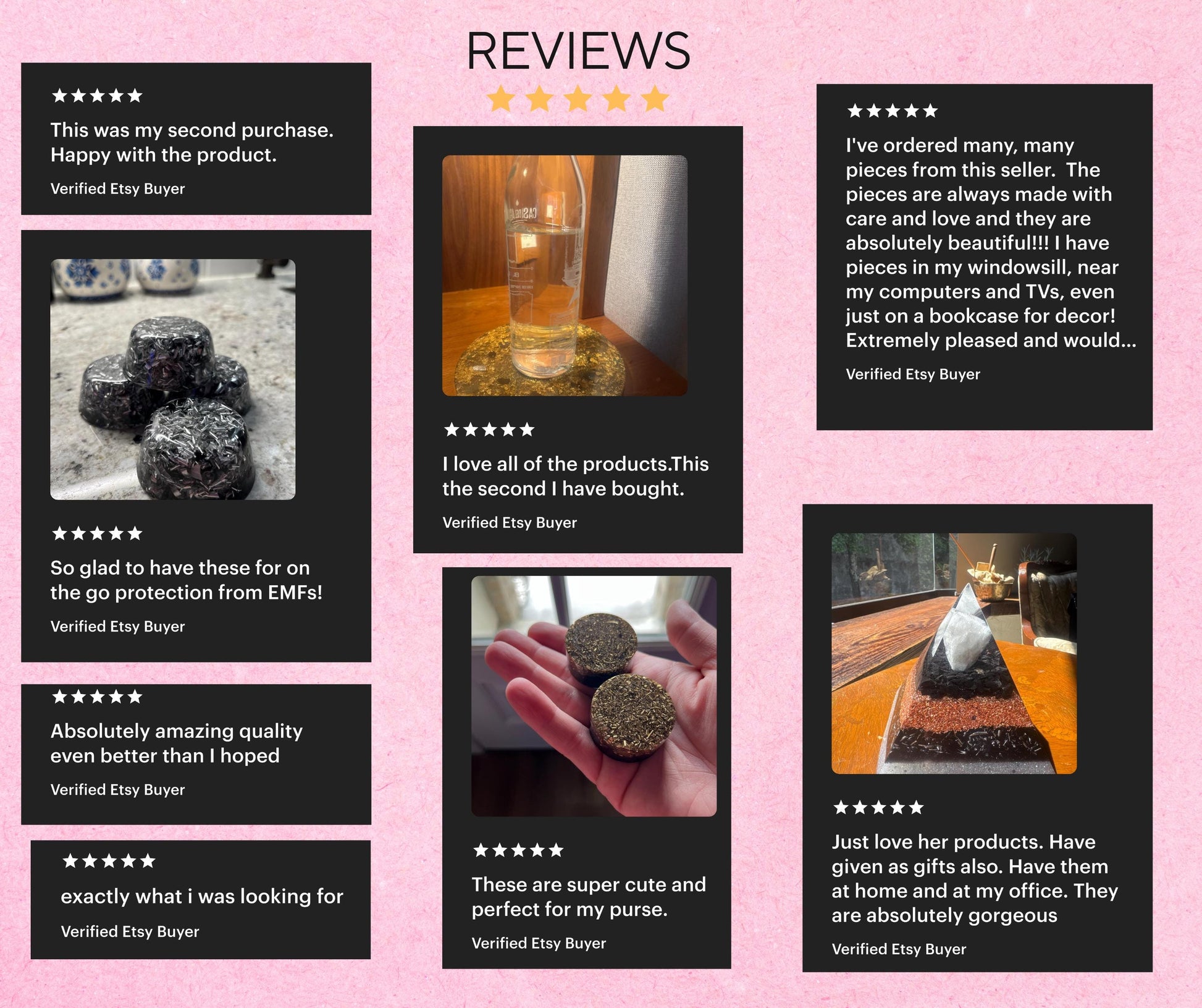 This handmade orgonite pyramid is designed for modern homes and offices. Crafted with a blend of copper, shungite, and clear quartz, each pyramid is poured and polished by hand to create a durable, eye-catching piece suitable for any tech-heavy environment.
