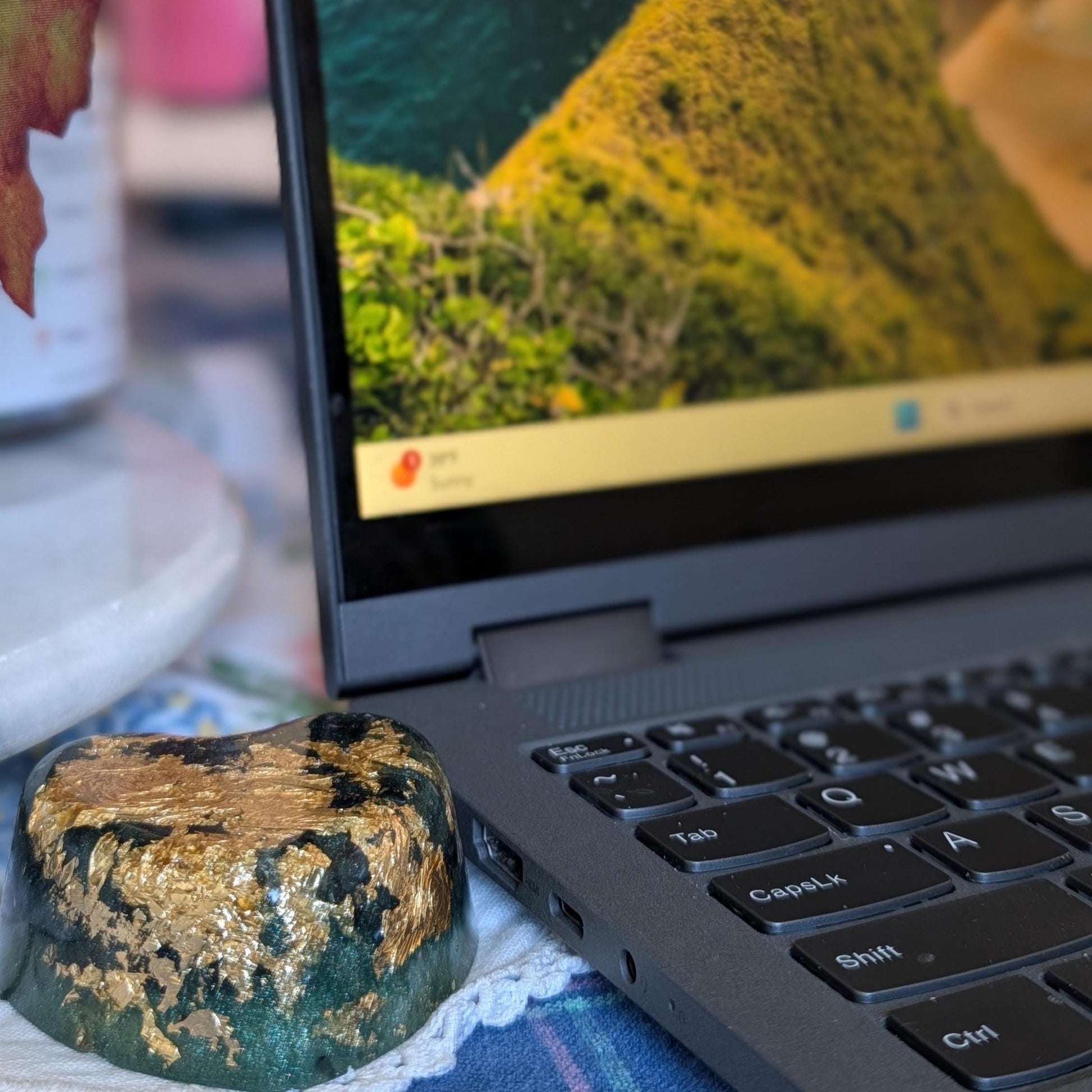 Bring a little warmth to your space with our Heart-Shaped Orgonite Tower Buster, handmade in Virginia by our husband-and-wife shop. Each piece is carefully crafted with resin, quartz crystal chips, gold flake, and steel shavings, creating a striking layered look that sparkles beautifully in the light.
