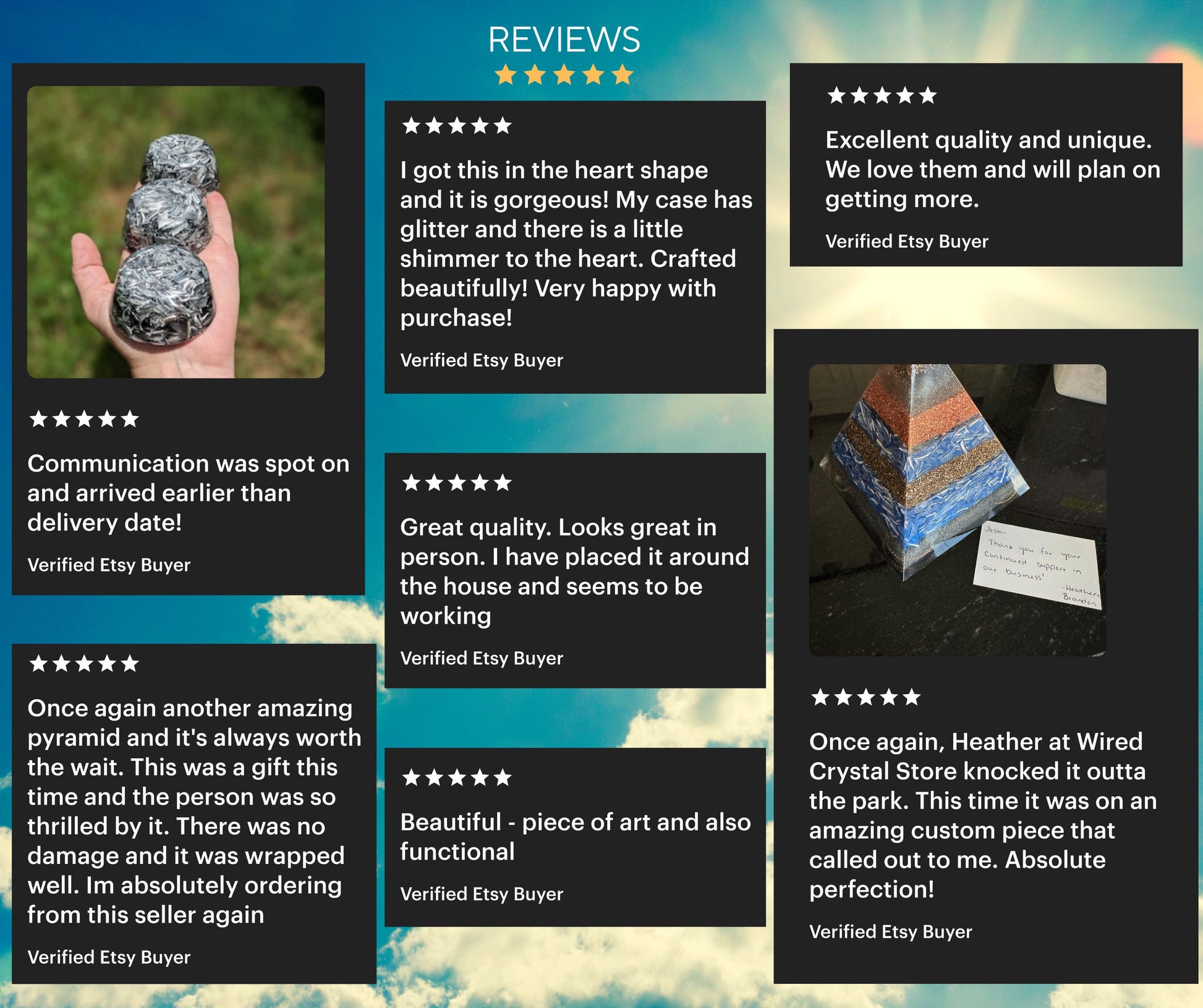his handcrafted orgonite tower buster combines natural minerals and metals in a sleek resin design—built for those who appreciate modern, functional art. Each piece is handmade in Virginia and finished with care to create a compact, durable accent for your workspace, home, or travel bag.