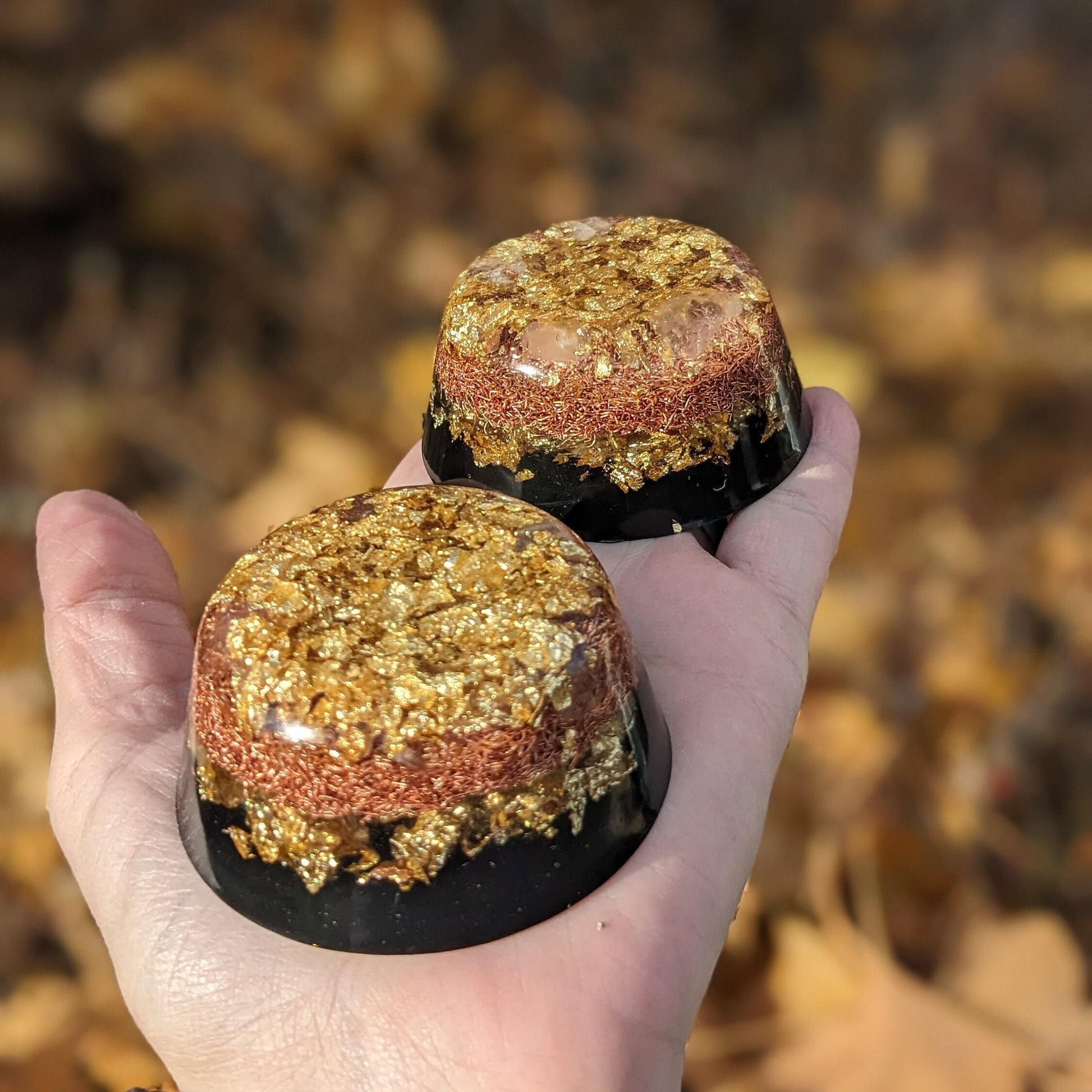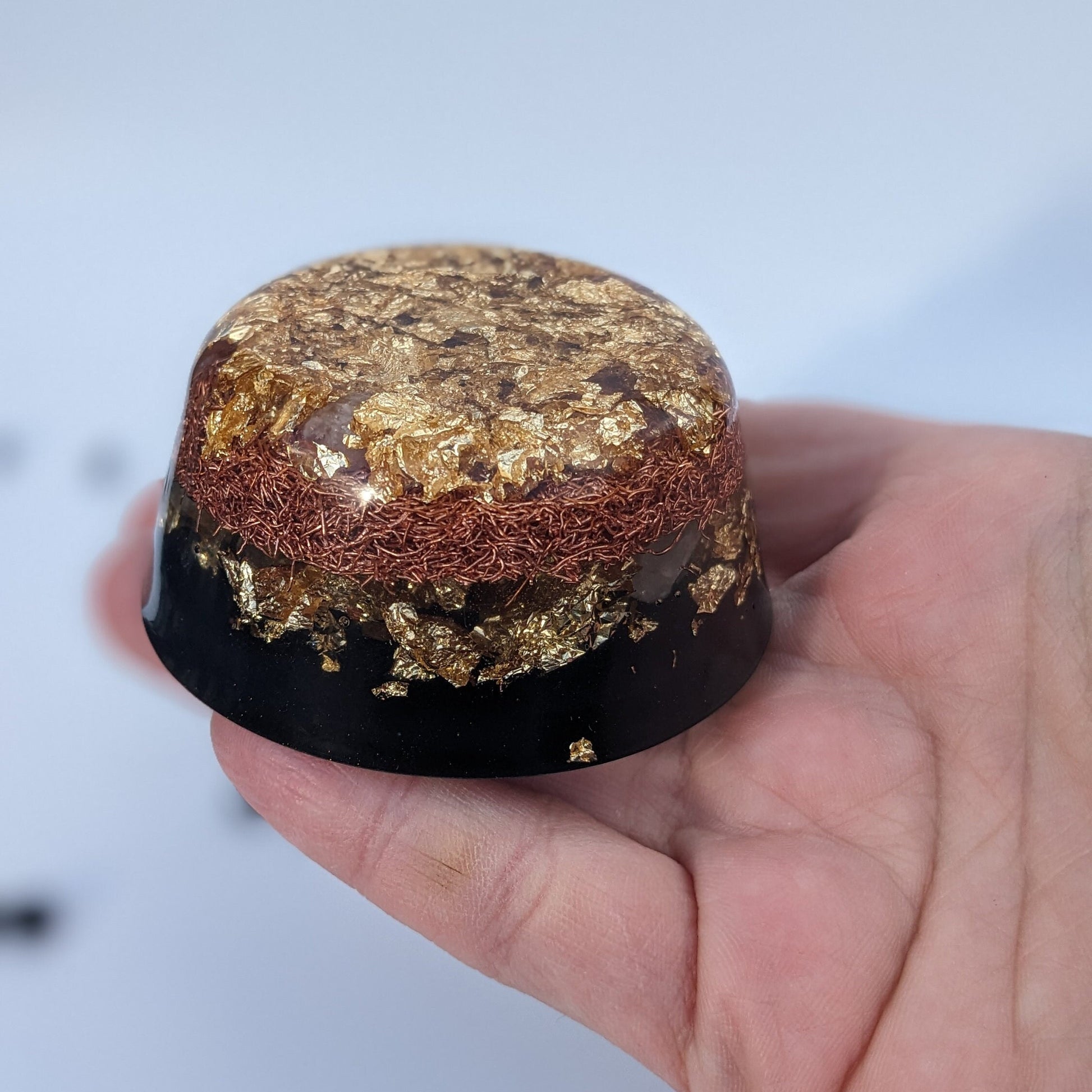 Materials: Resin, copper shavings, shungite, gold, clear quartz